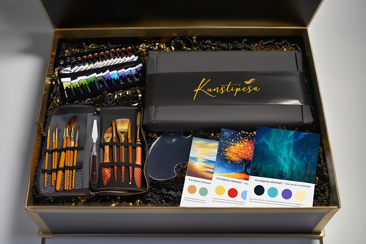 Kunstipesast leiad erilisi kinkekomplekte nii suurtele kui väikestele. Meie kingikarp on kingitus hingele – hetk rahu ja loovust igapäeva saginast välja astumiseks. Maali, joonista või lihtsalt lase värvidel voolata – loov tegevus vabastab pingest, toob meelerahu ja pakub rõõmu hetkes olemisest.